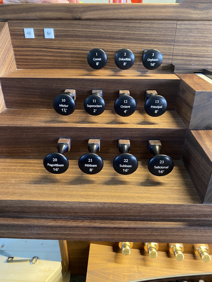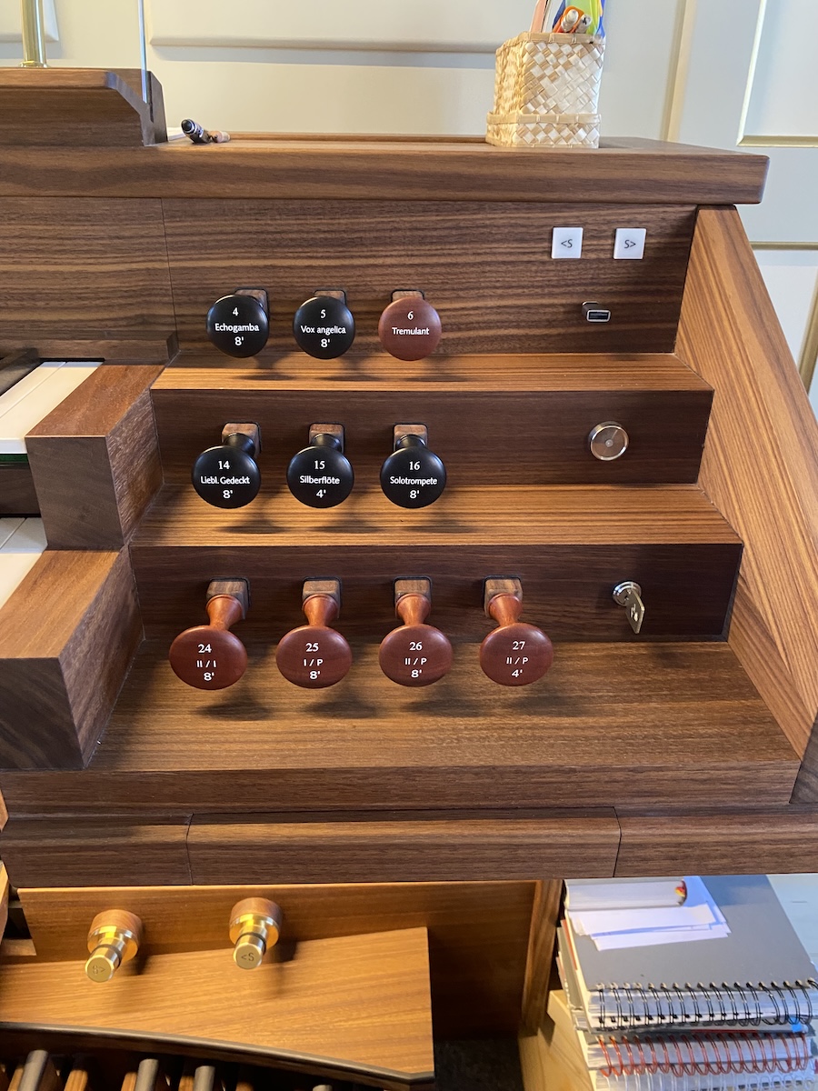 2. Manual, Nebenwerk C-g3/g4: Lieblich Gedeckt 8' (1862), Dolce 8' (Cäcilia-Pfeifen), Prästant 4', Nachthorn 4', Quint 2 2/3', Blockflöte 2', Zymbel 3f 1'.